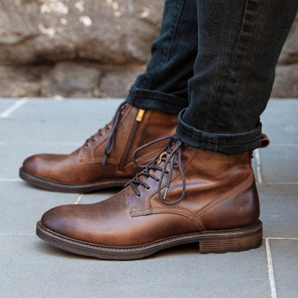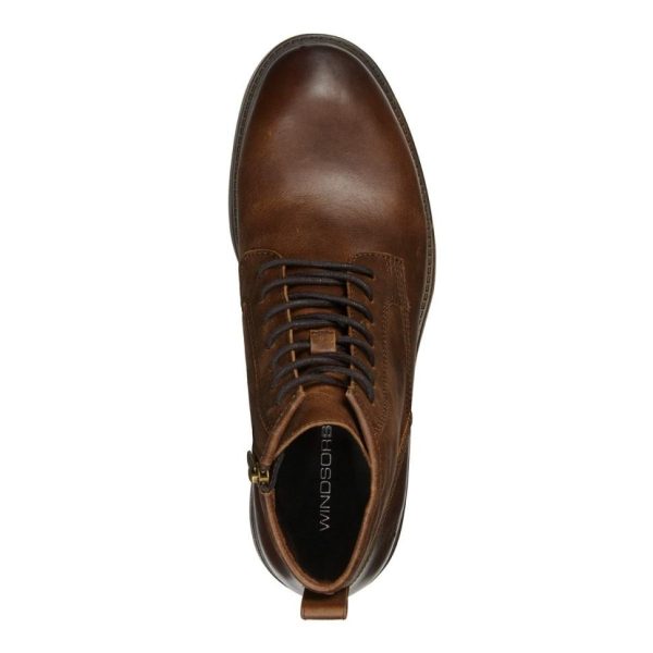 Windsorsmith’s brown lace-up boots for men, featuring a seven-eyelet facing with a plain front. The meticulous design includes twin rows of stitching detail, while the inside zip ensures ease of pulling on.