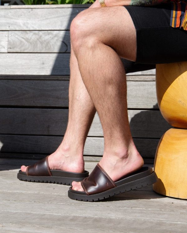 Rowdy, our men’s leather slides. With a sleek leather upper and effortless slip-on design, these leather slides offer both style and convenience for any occasion.