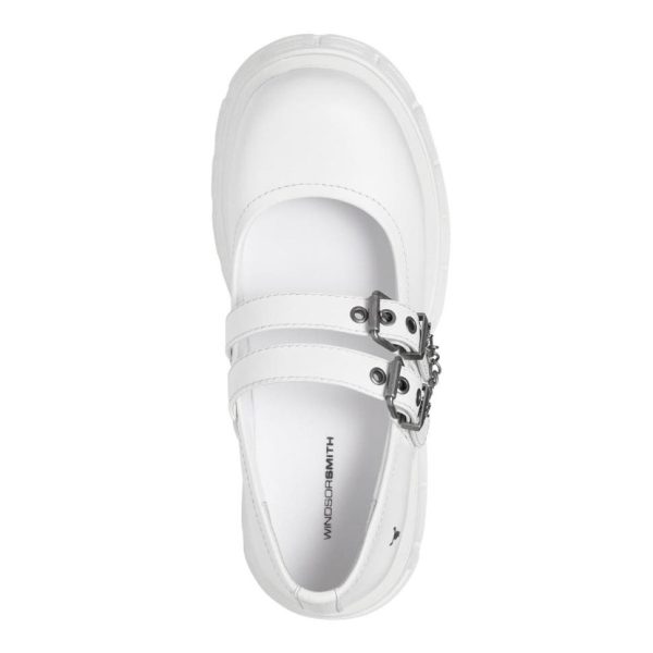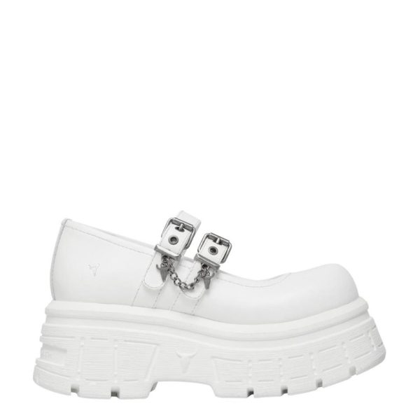 These white platform shoes boast a Mary-Janes style design with twin strap eyelet detailing on the upper and chunky cleated sole.