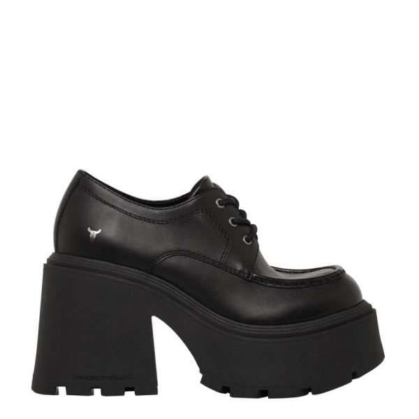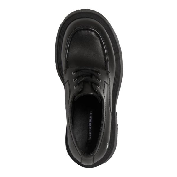 These women’s black chunky platform shoes feature Windsorsmith’s iconic cleated platform design, offering a bold and unique style statement.