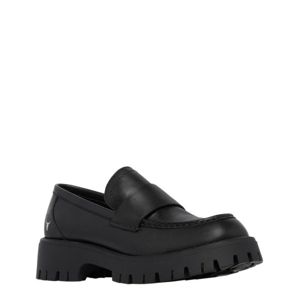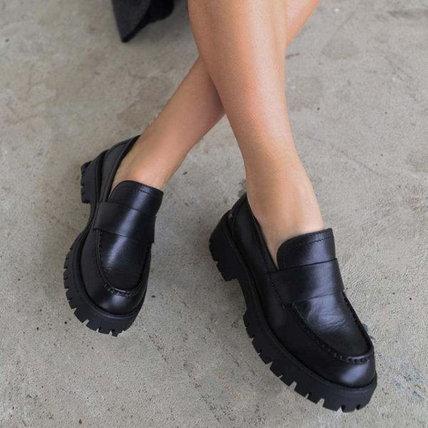 Black loafers featuring chunky cleated soles, makes an assertive statement.